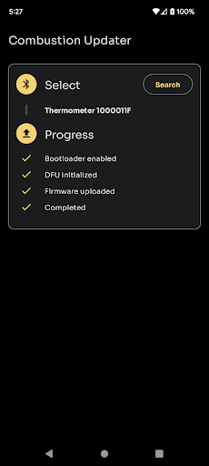 New Features: Use this app to update firmware on your wireless Predictive Thermometer and Display. Makes predictions more accurate, extends battery life, and adds new features to the onboard software. Includes important bug fixes, so please apply the firmware update as soon as you can.<br><br>Combustion Inc. Updater v1.2.0<br>- Installs Thermometer firmware version 1.1.0 <br>- Installs Display firmware version 1.1.0